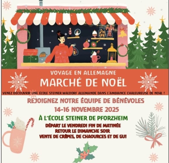 Comme tous les ans, nous sommes allées participer au Marché de l’Avent de la « Freie Waldorschule Pforzheim » en Allemagne. Nous y vendons des crêpes, du gui et du fromage au bénéfice de notre école, et nous profitons de l’ambiance de ce magnifique marché dans une grande école Waldorf !
